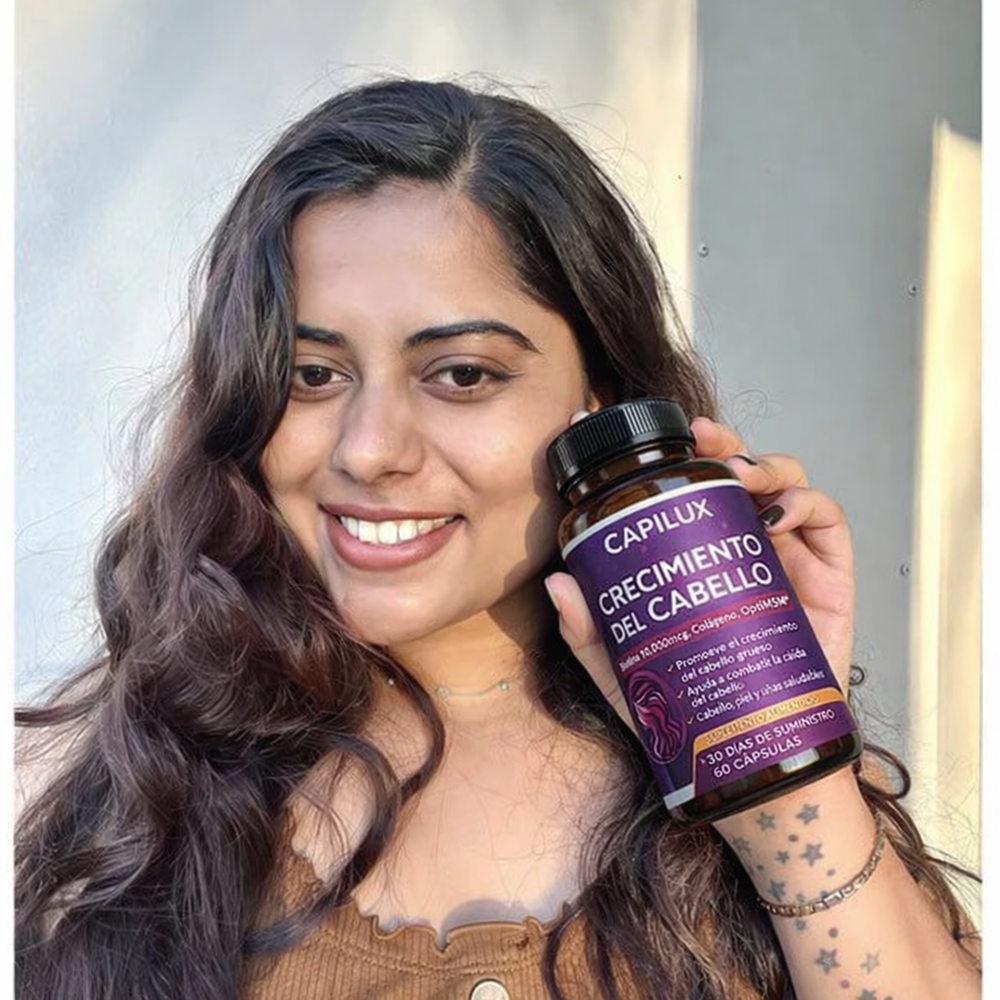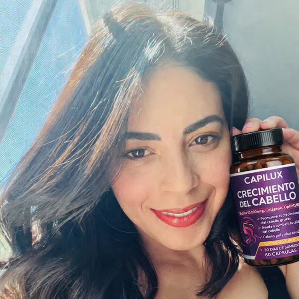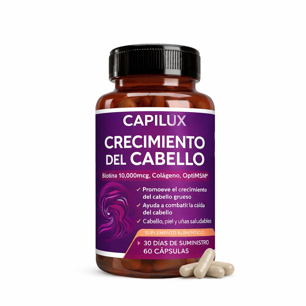 CAPILUX fue formulado con ingredientes conocidos por apoyar el crecimiento capilar como biotina, colágeno, zinc y extractos naturales que ayudan a nutrir el folículo desde el interior.